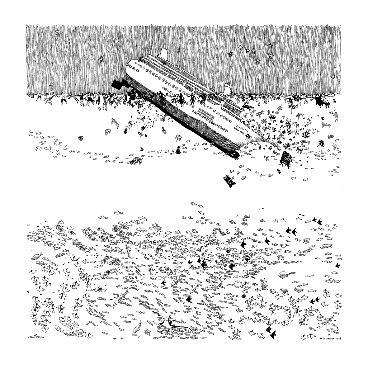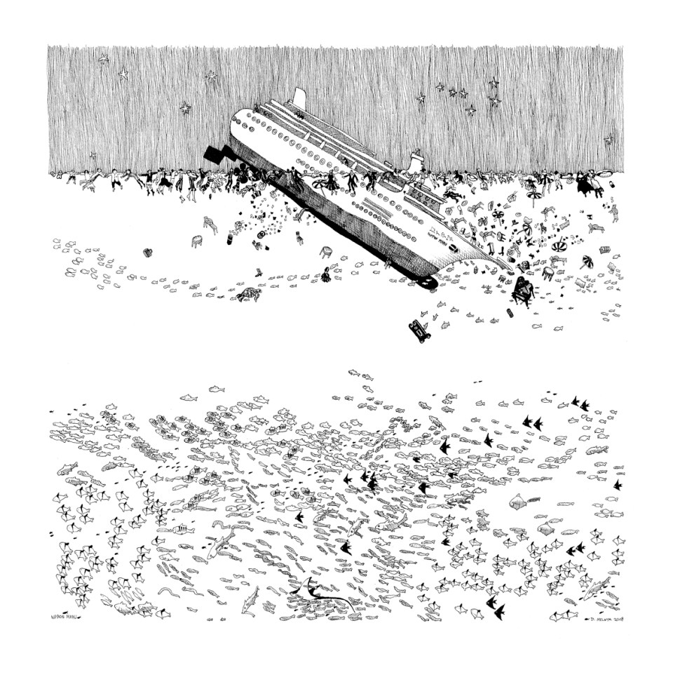 Doug has been working with performer Ian Mozdzen (Out Of Line Theatre) since 2009, developing a number of performance works (Monopoly Man Pit, Dalnavert Copperfield, Hollywood Hen Pit). Another ongoing project is Nippon Maru, an animated video being developed with Larry Glawson (computer animation) and Cathy Nosaty (music and audio). Nippon Maru is an animation derived from Melnyk’s existing drawings, silkscreens and cut-paper work, and tells the story of a small cruise ship that flounders and sinks in tropical waters, and follows the fates of her unlucky passengers, a number of whom exist briefly on a small island.